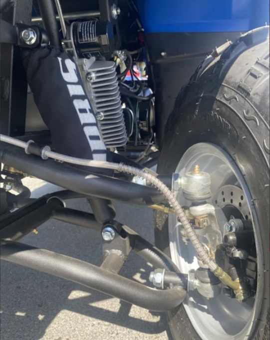 Независимая передняя подвеска позволяет легко маневрировать и держать уверенно курс. В наличие задний ход. На квадроцикле установлены большие внедорожные шины размером 23 дюйма передние и 22 дюйма задние. На задней оси установлены дополнительные защитные кожухи.