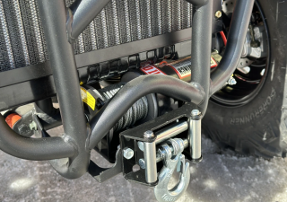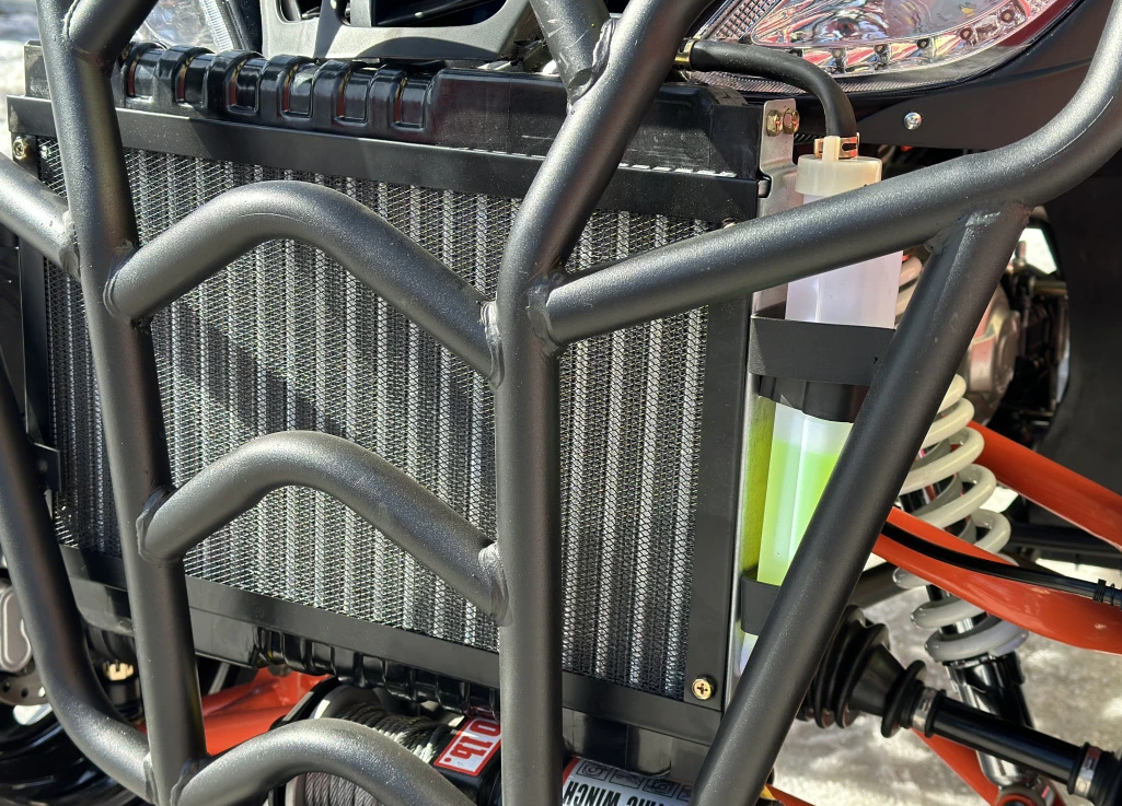 Передняя часть квадроцикла усилена в виде несущего бампера ,идущего по контуру всего квадроцикла и крепится к несущей раме, сделано это для жёсткости несущей конструкции при преодолении серьёзных препятствий и уклонов дороги.