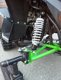 На данном квадроцикле установлен гусеничный модуль треугольной формы, что положительно сказывается на его клиренсе и проходимости. Спереди установлены широкие лыжи из прочного пластика, с металлическим усилителем в основании.