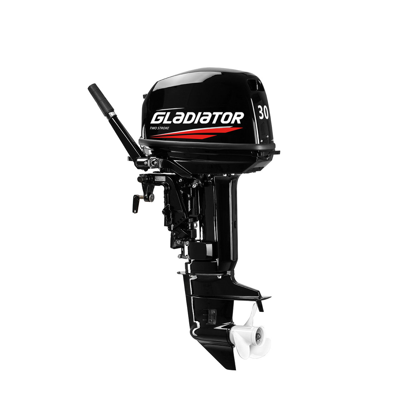 Gladiator G30FHS при весе 53 кг выдает мощность 30 л.с. Он устанавливается на надувные лодки с размером транца S, 381 мм. Удобная система крепления позволяет устанавливать и снимать его всего за несколько минут.Gladiator G30 FHS имеет 2 тактную конструкцию, что делает их надежными, а обслуживание и ремонт простым. Так же эти моторы имею невысокие требования к качеству топлива. Управление осуществляется с румпеля, есть три передачи (вперед, назад и нейтраль) для удобного маневрирования. Электронная система зажигания CDI гарантирует запуск в любых условиях. В базовое оснащение этой модели входит все необходимое для безопасного и комфортного плавания не только на мелководье, но и на отдаленных от берега участках.
