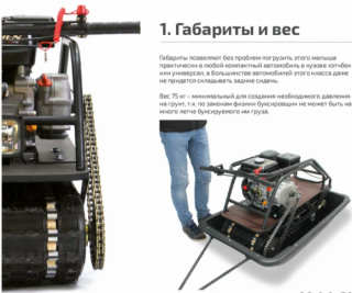 Мотобукс весит 80 кг, а размеры его составляют 100 см в длину, 43 см в ширину и 70 см в высоту. Модель оснащена гусеницей шириной 380 мм. Гусеница в сочетании с катковой подвеской способна проходить спокойно по льду и даже по территории без снега.