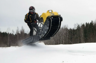 В конструкции мотовездехода используется цельная резиновая гусеница шириной 500 мм. Гусеница в сочетании с катковой подвеской способна проходить спокойно по льду и даже по территории без снега.