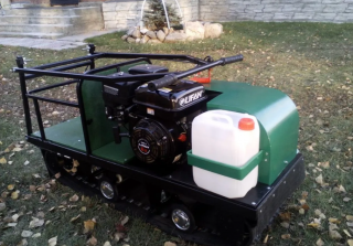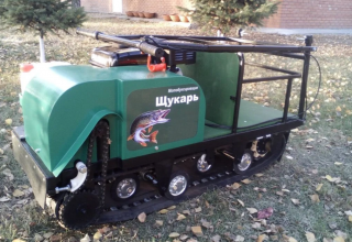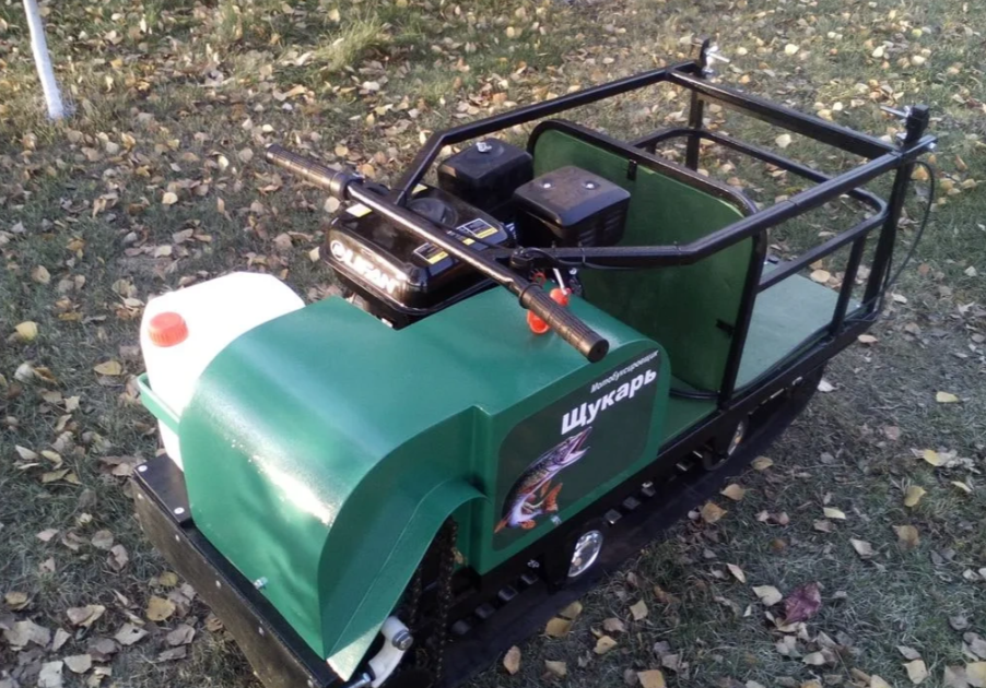 Передний привод для глубоко снега. Мотобуксировщик с двигателем 6.5 сил не уступает и более мощным двигателям по скорости и проходимости, но зависит на объем перевозимого веса. Катковая подвеска подойдет как для зимней езды, так и для летних покатушек. Гусеница с хорошим грунтозацепом и не просто будет её порвать или стереть. Задняя часть мотобуксировщика для перевозки вещей.