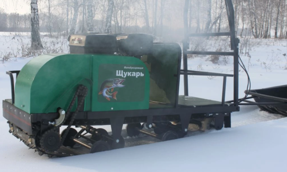 Передний привод для глубоко снега. Мотобуксировщик с двигателем 15 сил не уступает и более мощным двигателям по скорости и проходимости, но зависит на объем перевозимого веса. Катковая подвеска подойдет как для зимней езды, так и для летних покатушек. Гусеница с хорошим грунтозацепом и не просто будет её порвать или стереть. Задняя часть мотобуксировщика для перевозки вещей.- Производитель Щукарь