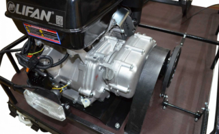 Двигатель с редуктором расположены по центру в передней части, на специальной стальной станине, надежно закрепленной к раме. Данное расположение силового агрегата, позволяет удачно сбалансировать центр тяжести, что положительно сказывается на удобстве управления буксом и создает большое багажное пространство для различных вещей, инструмента, провизии.